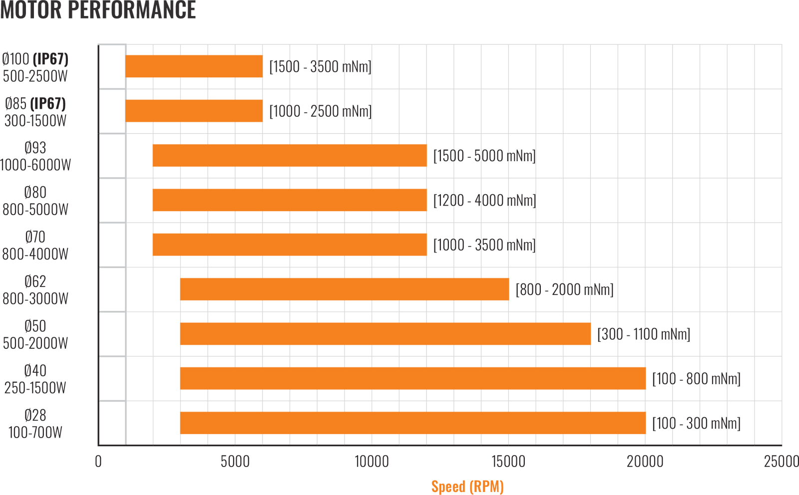Outside diameter (mm) | Peak Power (@) | Speed Min (RPM) | Speed Max (RPM) | Range Speed | Torque (mNm) |